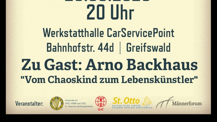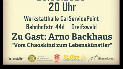 Drehmoment – Abende für Männer „Vom Chaoskind zum Lebenskünstler“ am Freitag, dem 29.05. um 20 Uhr in der KFZ-Werkstatthalle CarServicePoint, Bahnhofstraße 44 d in Greifswald.
