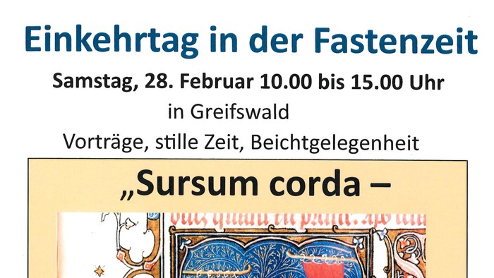 Einkehrtag in der Fastenzeit in der Pfarrei Sankt Otto mit dem Titel „Sursum Corda – Erhebet die Herzen“ am Samstag, dem 28.02. von 10 Uhr bis 15 Uhr im Gemeindehaus St. Joseph in Greifswald. Referent ist Dr Gregor Ploch. Es erwarten Sie Vorträge, stille Zeit und Beichtgelegenheit.