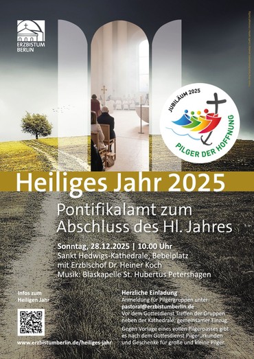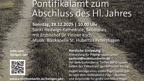 Das Heilige Jahr neigt sich dem Ende. In unserem Bistum beschließen wir es feierlich mit einem Pontifikalamt mit Erzbischof Heiner Koch am Sonntag, 28.12.2025, 10.00 Uhr, in der Sankt Hedwigs-Kathedrale in Berlin. Die Blaskapelle St. Hubertus Petershagen gestaltet den Gottesdienst musikalisch mit. Hierzu sind alle Gläubigen eingeladen, und ganz besonders diejenigen, die sich im Laufe des Jahres auf Pilgerwege begeben haben: als Pilgergruppen in den Pfarreien, auf Wegen quer durchs Bistum, bei Wallfahrten nach Rom oder bei vielen Veranstaltungen rund um „Pilger der Hoffnung“ an den verschiedenen Hoffnungsorten.