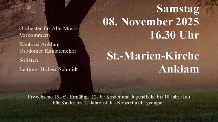 Die Kantorei Anklam gibt gemeinsam mit dem Orchester für Alte Musik Vorpommern, dem Usedomer Kantatenchor und Solisten unter Leitung von Holger Schmidt Mozarts Requiem am Samstag, dem 08.11. um 16:30 Uhr in der Marienkirche in Anklam.