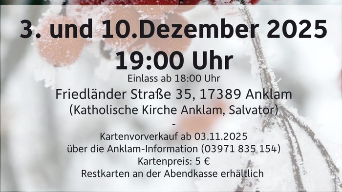 Kartenvorverkauf ab 03.11. über die Anklam-Information (03971 835 154)